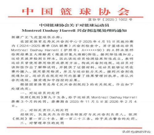 北京时间11月6日,根据中国篮协官方社媒公示,对于上个赛季新疆外援哈雷尔事件开出罚单,禁赛3个月,以及新疆俱乐部承担36000元的检测费用。