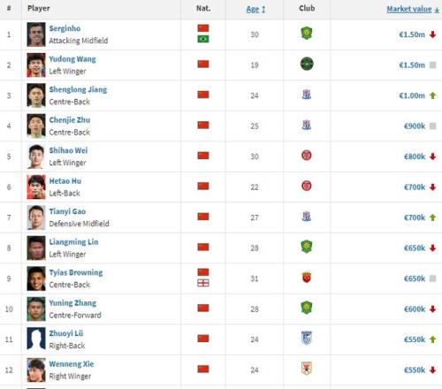 在本土球员里,塞尔吉尼奥、王钰栋以150万欧元排名榜首,其次是蒋圣龙(100万)、朱辰杰(90万),其中蒋圣龙身价上涨15万。几乎因伤缺席一年之后,武磊身价从120万下降到50万。