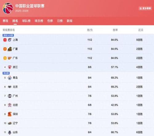 首先目前排在前五的球队分别是上海、广厦、广东、浙江以及青岛队。从这样的排名其实大家应该能够注意到两点非常大的亮点。首先第一个就是浙江队本赛季开赛以来的第一次冲进前五,目前是凭借着四连胜拿到了第四的战绩。