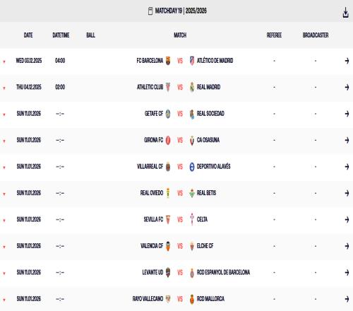 雷速体育10月30日宣 由于马德里竞技、巴塞罗那、毕尔巴鄂竞技、皇家马德里四队要在明年1月参加西班牙超级杯,为避免赛程冲突,西甲第19轮不得不提前进行。据西甲官方消息,巴萨